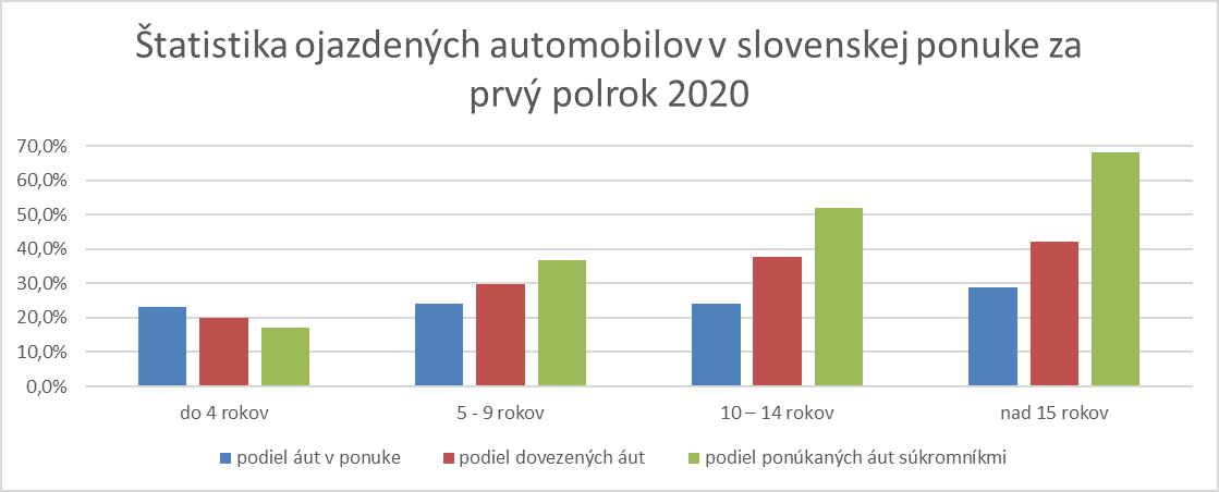Pomer automobilov podľa veku v ponuke na slovenskom trhu bol za posledný polrok tvorený z 23 % autami vo veku do štyroch rokov, z 24 % autami od päť do desať rokov, ďalších 24 % tvorili vozidlá vo veku od desať do štrnásť rokov a 29 % automobily staršie ako pätnásť rokov. V prípade zánovných áut pochádzalo 20 % z dovozu. Išlo prevažne o modely áut s výbavou, ktorá na Slovensku nie je dostupná. „Môžeme povedať, že čím mladšie vozidlo si kúpite, tým podstupujete menšie riziko, že pôjde o auto zo zahraničia s ťažko dohľadateľnou históriou. V bazároch okrem toho zaplatíte menej peňazí než u súkromníkov, a to práve v prípade mladších áut. Veľkí predajcovia si ale s rastúcim vekom vozidla lepšie strážia kvalitu, preto, naopak, súkromníci ponúkajú staršie vozidlá lacnejšie. Takmer vždy sa to ale odráža na kvalite a stave vozidla a cene nutných dodatočných opráv,“ uviedla Karolína Topolová, generálna riaditeľka a predsedníčka predstavenstva skupiny AURES Holdings. Autá vo veku nad 15 rokov sa v takmer 70 percentách predávajú medzi fyzickými osobami mimo bazárov. Pri autách do štyroch rokov ide o 17 percent.